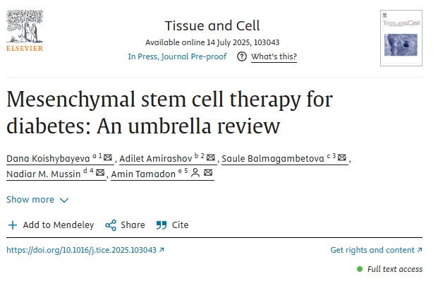 2025年7月,國際著(zhù)名期刊雜志《Tissue and Cell》發(fā)表了一篇“間充質(zhì)干細胞治療糖尿?。壕C述”的文章綜述[1]。