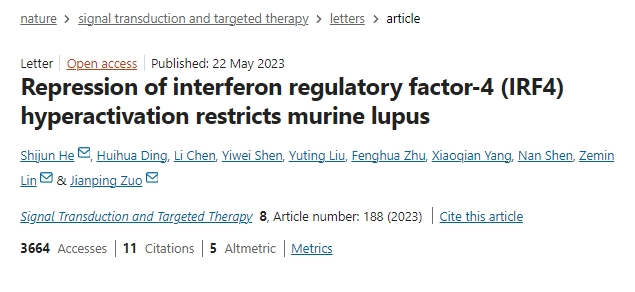研究通過(guò)轉錄組學(xué)分析發(fā)現,LN患者腎臟組織中干擾素調節因子4(IRF4)顯著(zhù)上調,且其表達水平與尿蛋白、自身抗體、漿細胞及生發(fā)中心B細胞比例呈正相關(guān);而SM934治療可顯著(zhù)下調狼瘡小鼠腎臟IRF4表達,并在功能上抑制致病性Th17細胞分化及漿細胞抗體分泌。