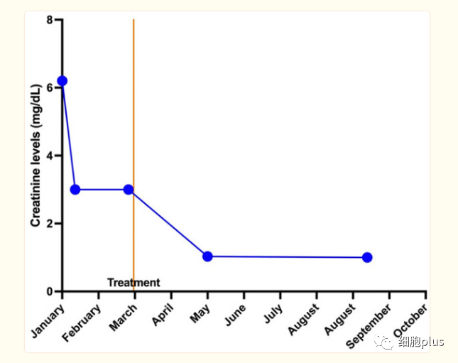 圖1 急性腎衰竭患者的肌酐水平(mg/dL)。腎衰竭發(fā)生在2020年1月。該患者于2020年3月接受了1.2億UC-MSCs,并于2020年5月和9月進(jìn)行了隨訪(fǎng)。