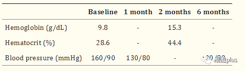 在2個(gè)月隨訪(fǎng)時(shí),血液檢查顯示血紅蛋白為15.3 g/dL,HCT為44.4%(表1),他的肌酐水平已經(jīng)下降到1.03毫克/分升(圖1)。(肌酐正常????值:0.6 to 1.2mg/dL )????