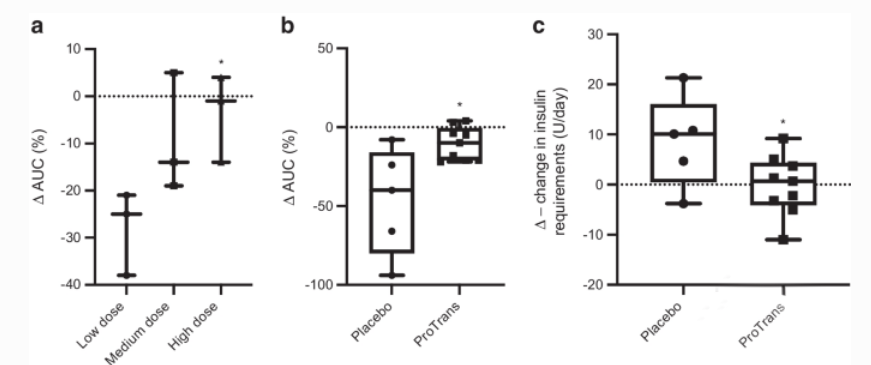 ● 安慰劑治療組的C肽AUC水平下降了47%,而干細胞治療組僅下降了10%,兩組有顯著(zhù)差異(p<0.05)。見(jiàn)下圖b
