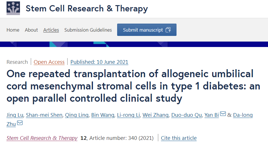 2023年5月21日,最新發(fā)表在《Diabetologia》糖尿病學(xué)雜志(2022年影響因子/JCR分區:10.460/Q1)的一項來(lái)自瑞典的I/II期隨機雙盲安慰劑對照試驗證實(shí),臍帶來(lái)源的間充質(zhì)干細胞可維持1型糖尿病患者內源性胰島素的產(chǎn)生。