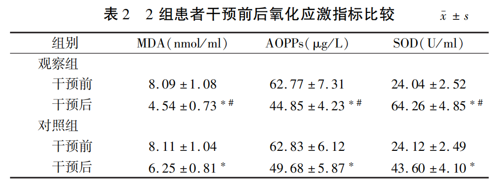 (3)氧化應激指標:采集2組患者治療前后的空腹靜脈血3ml,3000r/min離心機中離心10min取血清,采用酶聯(lián)免疫吸附 (ELISA)檢測MDA、AOPPs、SOD水平。?