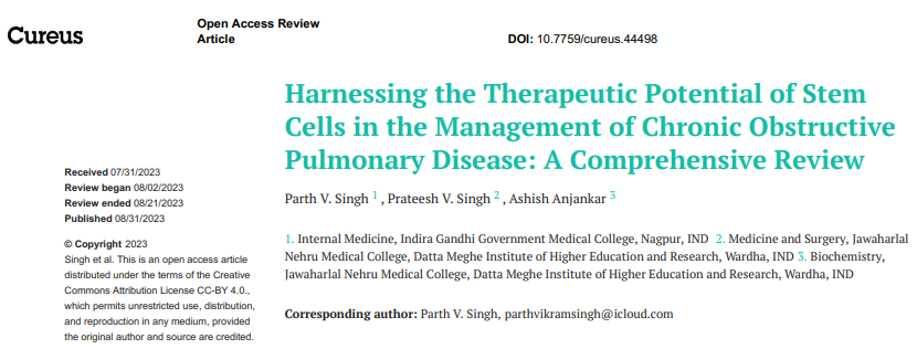 3、Singh PV, Singh PV, Anjankar A. Harnessing the Therapeutic Potential of Stem Cells in the Management of Chronic Obstructive Pulmonary Disease: A Comprehensive Review. Cureus. 2023 Aug 31;15(8):e44498. doi: 10.7759/cureus.44498. PMID: 37711945; PMCID: PMC10497883.