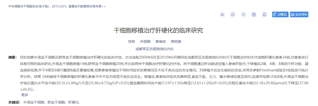 2015年,中華細胞與干細胞雜志(電子版)發(fā)表了一篇干細胞移植治療肝硬化的臨床研究的論文[3]。