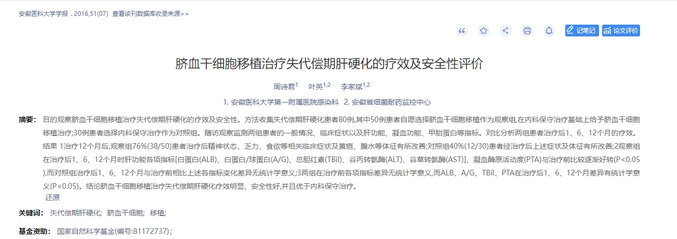 2016年,安徽醫科大學(xué)學(xué)報報道了一篇臍血干細胞移植治療失代償期肝硬化的療效及安全性評價(jià)的臨床研究綜述[4]。