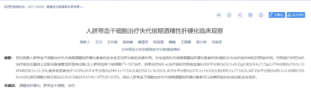 2017年,實(shí)用肝臟病雜志刊發(fā)了一篇人臍帶血干細胞治療失代償期酒精性肝硬化臨床觀(guān)察的文章[5]。