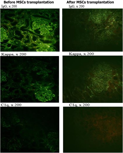 接受間充質(zhì)干細胞移植后,腎臟活檢的免疫熒光顯示腎小球血管環(huán)中的免疫炎癥過(guò)程減少:IgG、kappa 和 C1q 染色強度降低。