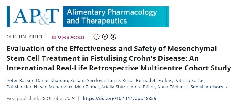 [1]:Bacsur, P., Shaham, D., Serclova, Z., Resál, T., Farkas, B., Sarlós, P., Miheller, P., Maharshak, N., Zemel, M., Shitrit, A., Bálint, A., Fábián, A., Bor, R., B?sze, Z., Ivány, E., Szepes, Z., Farkas, K., Tóth, I., Lázár, G., Vlkova, K., Tremerova, A., Zuskova, P., ábrahám, S. and Molnár, T. (2024), Evaluation of the Effectiveness and Safety of Mesenchymal Stem Cell Treatment in Fistulising Crohn’s Disease: An International Real-Life Retrospective Multicentre Cohort Study. Aliment Pharmacol Ther. https://doi.org/10.1111/apt.18359