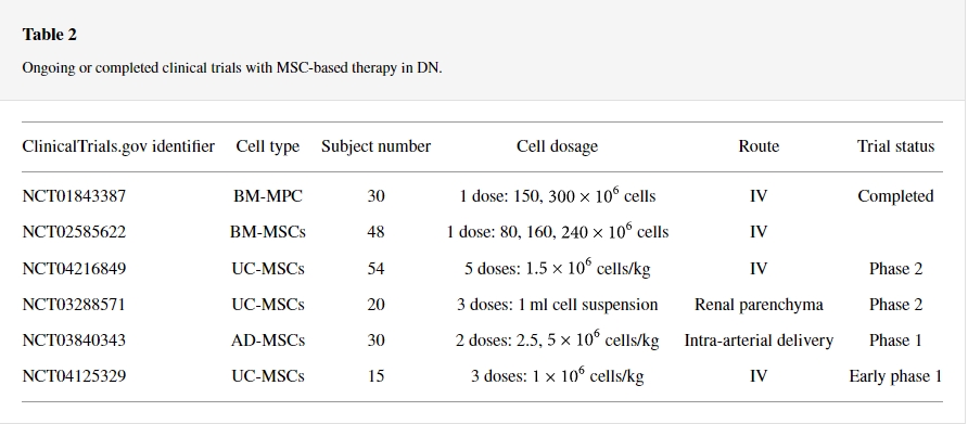 此外,在第12周,在MPC治療組中觀(guān)察到更穩定或改善的eGFR和mGFR,從而為干細胞在這種疾病中的作用提供了潛在的機制線(xiàn)索。大部分臨床試驗處于I期或II期研究,旨在評估安全性和耐受性,探索細胞療法的治療效果,表明干細胞及相關(guān)療法的臨床應用還有很長(cháng)的路要走。