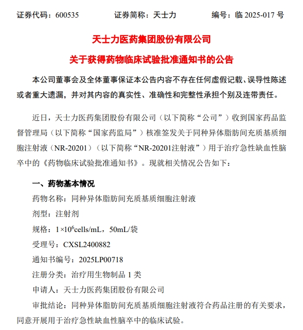 該藥物由天士力醫藥集團自主研發(fā),擬用于治療急性缺血性腦卒中。此次批準標志著(zhù)中國在細胞治療領(lǐng)域實(shí)現重大突破,成為全球少數完成此類(lèi)藥物監管審評的國家之一。