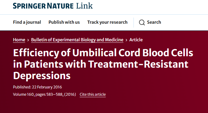 2016年2月22日,俄羅斯莫斯科醫學(xué)科學(xué)院心理健康研究中心的研究人員在國際期刊《Bulletin of Experimental Biology and Medicine》上發(fā)表了一篇關(guān)于《臍帶血細胞對難治性抑郁癥患者的治療效果》的研究結果。【1】