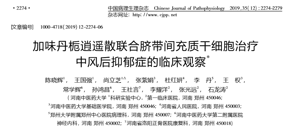 2019年12月15日,河南中醫藥大學(xué)科研實(shí)驗中心在《中國病理生理雜志》上發(fā)表了一篇關(guān)于《加味丹梔逍遙散聯(lián)合臍帶間充質(zhì)干細胞治療中風(fēng)后抑郁癥的臨床觀(guān)察》的研究結果。【2】