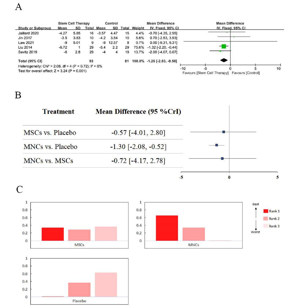 ?(A) 用于直接薈萃分析的良好恢復森林圖。(B) 用于網(wǎng)絡(luò )薈萃分析的良好恢復森林圖。(C) 不同類(lèi)型干細胞移植的排名位置。MSC、MNC 和 MAPC 的 SUCRA 分別為 80%、51% 和 50%。