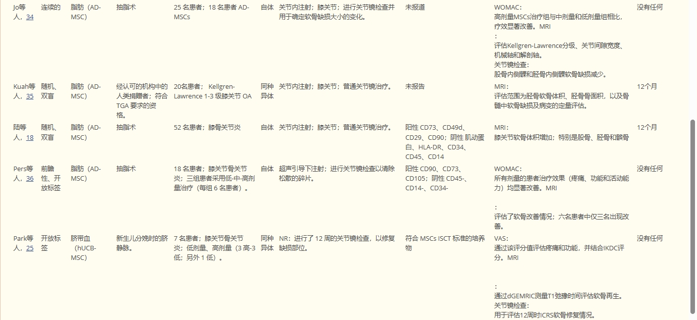 所有納入研究均聚焦于膝骨關(guān)節炎(OA)患者,他們接受了主要通過(guò)關(guān)節內注射的間充質(zhì)干細胞(MSCs) 治療(部分研究聯(lián)合關(guān)節鏡),旨在改善膝關(guān)節損傷狀況;