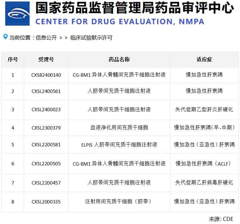 據國家藥監局藥品審評中心數據顯示:截止2025年5月30日,國家已默示許可72款間充質(zhì)干細胞類(lèi)藥物臨床試驗,其中8款用于肝病治療(占比近12%),且6項直接針對肝衰竭。這不僅反映出國家對干細胞治療肝病的重視,也說(shuō)明這一領(lǐng)域已成為干細胞藥物研發(fā)的重要方向。[6]