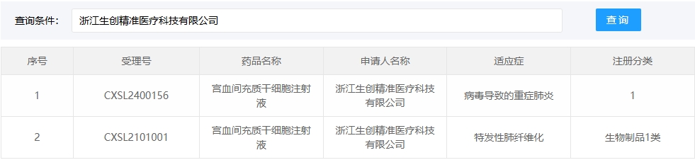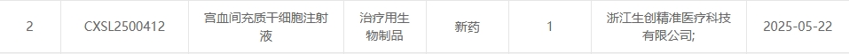 新增受理13:2025年05月22號,浙江生創(chuàng )精準醫療科技有限公司的宮血間充質(zhì)干細胞注射液的臨床試驗申請獲受理(受理號:CXSL2500412)。這是該款細胞注射液3獲得受理。