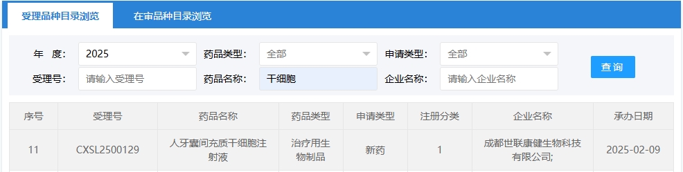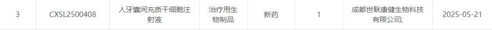 新增受理12:2025年05月21號,成都世聯(lián)康健生物科技有限公司的人牙囊間充質(zhì)干細胞注射液的臨床試驗申請獲受理(受理號:CXSL2500408)。這是該款細胞注射液第1次獲得受理。