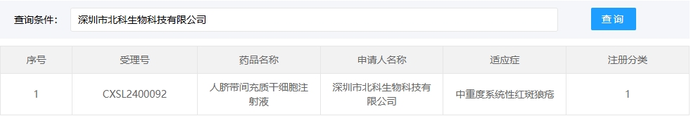 新增受理10:2025年05月01號,深圳市北科生物科技有限公司的人臍帶間充質(zhì)干細胞注射液的臨床試驗申請獲受理(受理號:CXSL2400092)。這是該款細胞注射液1獲得受理。適應癥:中重度系統性紅斑狼瘡。