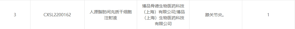 新增受理2:2025年1月25日,博品骨德(深圳)生物醫藥科技有限公司;博品(上海)生物醫藥科技有限公司的人源脂肪間充質(zhì)干細胞注射液的臨床試驗申請獲受理(受理號:CXSL2200162),這是該款細胞注射液第1次獲得受理,適應癥:膝關(guān)節炎。