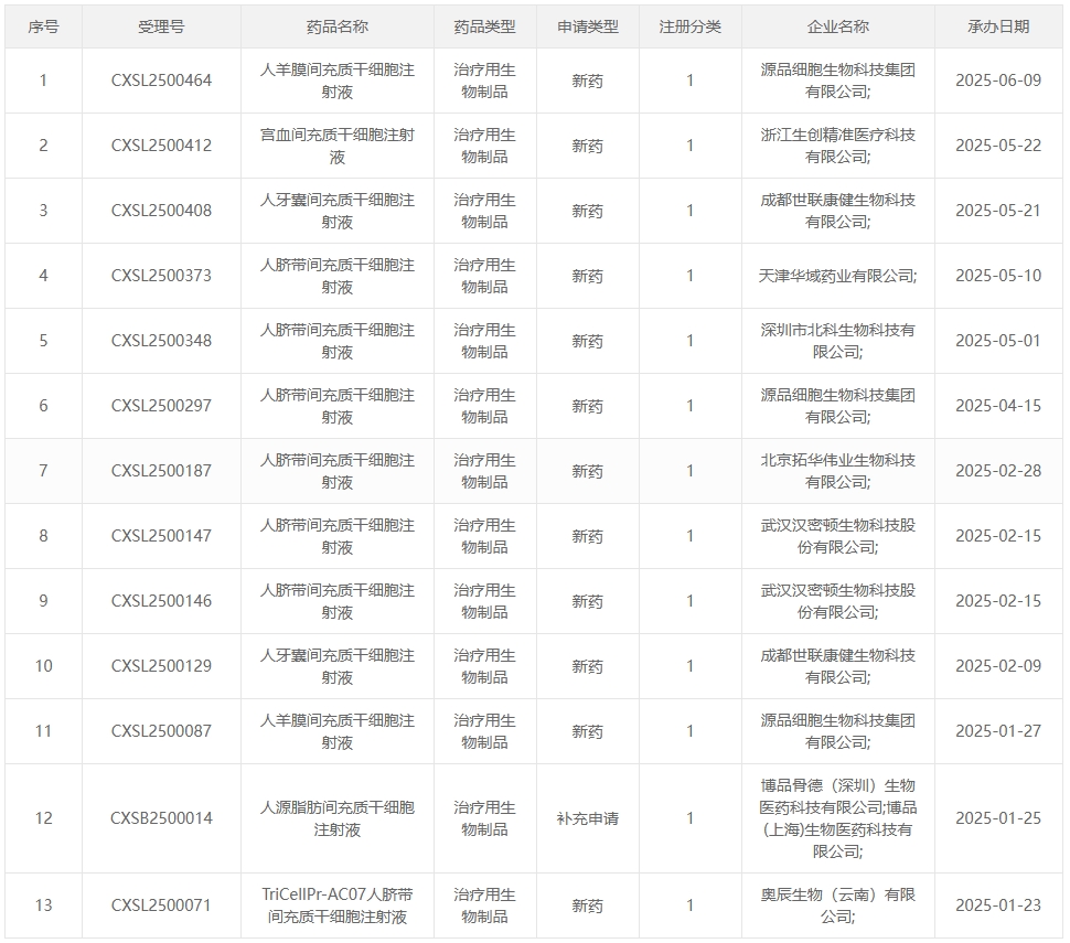 02:2025年1-5月受理的13項干細胞藥物臨床試驗申請詳細