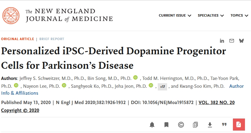 首例自體細胞移植實(shí)踐:2020年在《新英格蘭醫學(xué)雜志》上發(fā)表了一篇“個(gè)性化iPSC衍生多巴胺祖細胞治療帕金森病”的研究報告,這是全球首例開(kāi)展的自體誘導多能干細胞移植治療帕金森病的臨床試驗。試驗報告了將患者來(lái)源的中腦多巴胺能祖細胞植入一名特發(fā)性帕金森病患者的案例,通過(guò)分階段向患者雙側殼核立體定向植入400萬(wàn)自體源多巴胺神經(jīng)元。