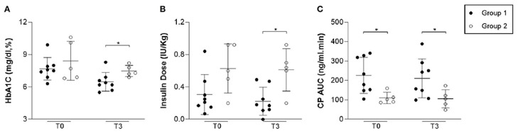 (A) 在A(yíng)SC輸注前 (T0) 和三個(gè)月后 (T3) 測量的HbA1C水平。第1組的HbA1C水平顯著(zhù)低于第2組 (p=0.03)。(B) 在 ASC 輸注前 (T0) 和三個(gè)月后 (T3) 所需的胰島素劑量。第1組所需的胰島素劑量顯著(zhù)低于第2組 (p=0.01)。(C) 在 ASC 輸注前 (T0) 和三個(gè)月后 (T3) 測量的C肽AUC。第1組和第2組的C肽AUC沒(méi)有顯著(zhù)差異 (p=0.06)。圖中的星號表示兩組之間存在統計學(xué)上的顯著(zhù)差異。