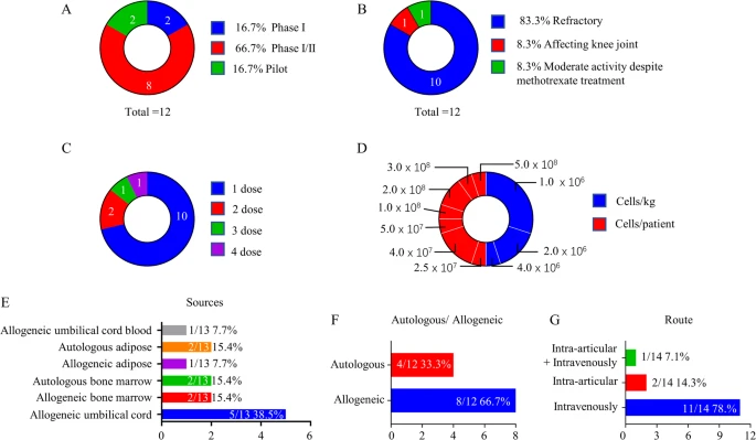 治療方案上:給藥次數以單次為主,多次給藥多為2-4劑,間隔1周至3個(gè)月(圖5C);細胞劑量多按體重計算(1–4×10?/kg),部分按固定細胞數(2.5×10?–3×10?)(圖5D);使用細胞來(lái)源包括臍帶(UC)、骨髓(BM)、脂肪(AD)和臍帶血(UCB)-MSCs(圖5E),其中UC-MSC多用于異體移植,BM/AD-MSC多用于自體移植(但BM-MSC獲取有創(chuàng )且效率較低)(圖5F);主要給藥途徑為靜脈注射(IV),關(guān)節內注射(IA)次之,僅1項研究聯(lián)合使用(圖5G)。