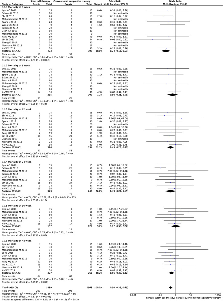 17項研究(3452名受試者)被納入全因死亡率分析(圖3)。與常規治療相比,干細胞治療與全因死亡率顯著(zhù)降低相關(guān),第4周(OR=0.24,95%CI0.11至0.51;P=0.0002)、第12周(OR=0.49,95%CI0.29至 0.80;P=0.005)和第48周(OR=0.56,95%CI0.37至0.87;P=0.01)。