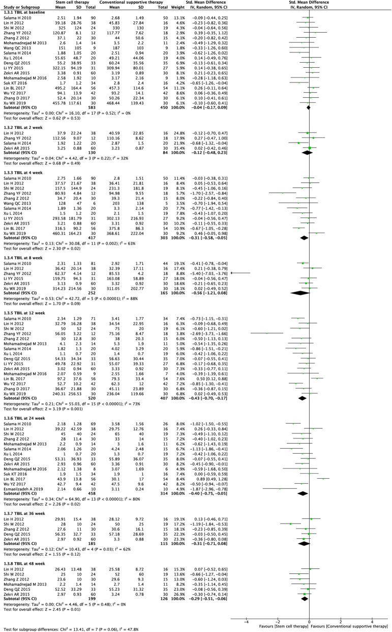 19項研究(4708名受試者)被納入TBIL水平的分析(圖5)。治療前,實(shí)驗組和對照組之間未觀(guān)察到顯著(zhù)差異(SMD=?0.04,95%CI?0.17至0.09;P=0.53)。治療后,干細胞治療與第4周(SMD=?0.31,95%CI? 0.58至?0.05;P=0.02)、第12周(SMD=?0.43,95%CI?0.70至?0.17;P=0.001),第24周(SMD=?0.40,95%CI?0.75至?0.05;P=0.02)和第48周(SMD=?0.29,95%CI ? 0.51至?0.06;P= 0.01)。