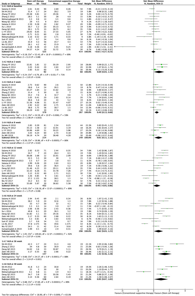 17項研究(4173名受試者)被納入ALB水平的分析(圖6)。治療前,實(shí)驗組和對照組之間未觀(guān)察到顯著(zhù)差異(SMD =?0.02,95%CI?0.27至0.23;P=0.88)。治療后,干細胞療法與第2周(SMD=0.69,95%CI 0.03至1.35;P=0.04)、第 4 周(SMD=0.40,95%CI 0.13至0.66;P=0.003 )的ALB水平顯著(zhù)升高相關(guān)),第8周(SMD=0.61,95%CI0.11至1.12;P=0.02),第24周(SMD=0.62,95%CI0.03至1.21;P=0.04),第36周(SMD=1.42,95% CI 0.56 至 2.28;P=0.001)和第48周(SMD=0.95,95%CI0.07至1.83;P= 0.03)。