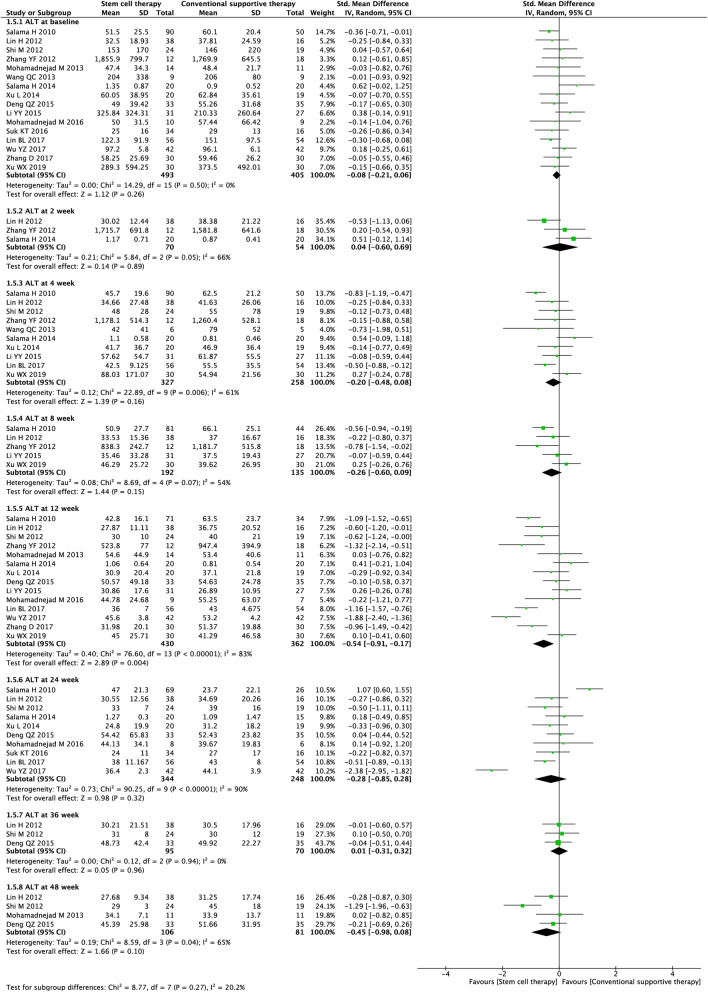 16項研究(3670名受試者)被納入ALT水平的分析(圖7)。治療前,實(shí)驗組和對照組之間未觀(guān)察到顯著(zhù)差異(SMD=?0.08,95%CI?0.21至0.06;P=0.26)。治療后,干細胞療法僅在第12周與顯著(zhù)降低的ALT水平相關(guān)(SMD=?0.54,95%CI?0.91至?0.17;P=0.004)。