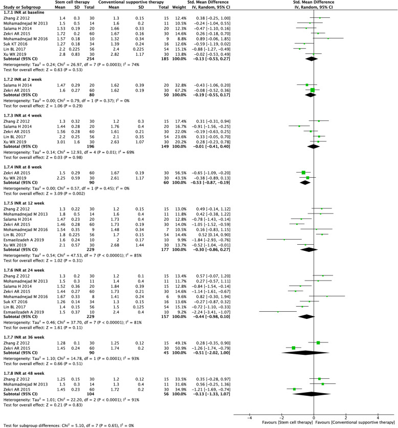 包含2853名參與者的10項研究和包含2151名參與者的9項研究被納入PTA水平的分析(圖8)和INR水平(圖9), 分別。治療前,在實(shí)驗組和對照組之間未觀(guān)察到PTA水平和INR水平的顯著(zhù)差異[(SMD=0.04,95% CI – 0.17至0.24;P=0.71),(SMD=0.13,95%CI-0.53至0.27;P=0.53)]。治療后,干細胞治療與第 24周時(shí)PTA水平顯著(zhù)升高(SMD=0.51,95%CI 0.09 至 0.94;P=0.02)和第8周時(shí)INR水平降低(SMD = ? 0.53,95% CI?0.87)相關(guān)至?0.19;P=0.002)。