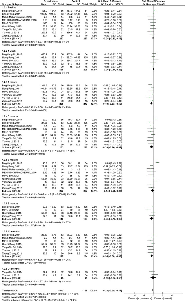 在這項研究中,還通過(guò)分析 TBIL 和 ALT 水平來(lái)評估干細胞療法對減輕肝損傷的作用。干細胞治療后1、3、12個(gè)月,TBIL 水平顯著(zhù)下降(p=0.0008;p=0.04;p=0.007)。與對照組相比,在1周、6、9和24個(gè)月時(shí)間點(diǎn)均無(wú)顯著(zhù)性差異(圖4)。除3、6 和9個(gè)月外,未檢測到關(guān)于TBIL水平的異質(zhì)性。但這只能通過(guò)一兩項研究來(lái)解釋。