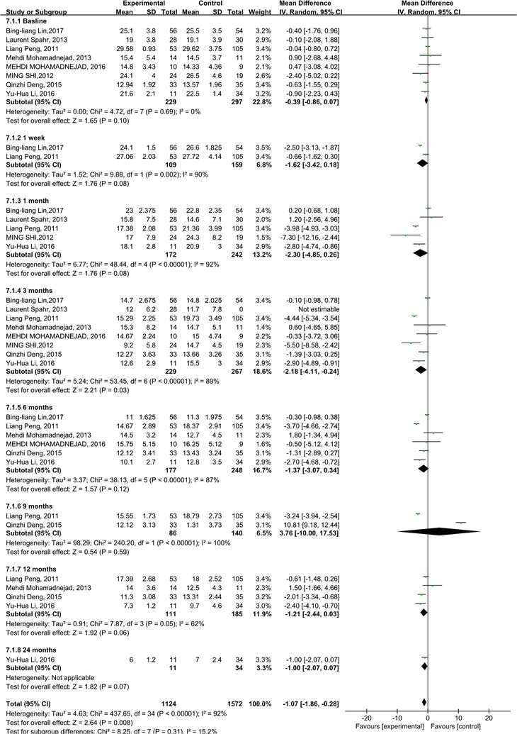 MELD評分主要用于評估終末期肝病的預后。我們觀(guān)察到干細胞治療組和對照組的MELD評分均有所下降。干細胞治療組和對照組之間存在顯著(zhù)差異 (p =0.008)(圖6)。此外,盡管進(jìn)行了亞組分析,但這些研究的異質(zhì)性很高 (I 2 : 62–100%)。但這也可以?xún)H通過(guò)一兩項研究來(lái)解釋。