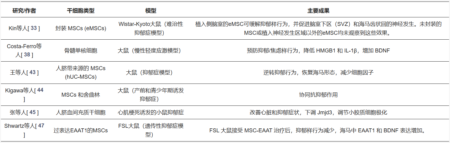 臨床前研究表明,基于干細胞的療法,尤其是涉及間充質(zhì)干細胞 (MSC) 的療法,在治療抑郁癥方面擁有巨大的潛力。使用各種抑郁癥動(dòng)物模型(包括慢性應激模型和像Wistar-Kyoto大鼠這樣的難治性品系)進(jìn)行的研究表明,MSC以及細胞包被和細胞外囊泡 (EV) 等相關(guān)方法可以顯著(zhù)減少抑郁樣行為。