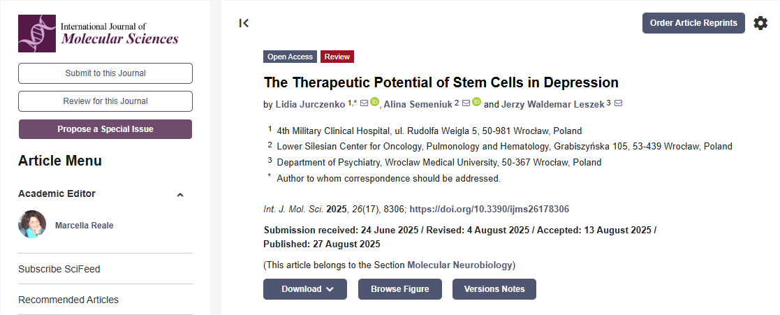 在此背景下,2025年8月27號,國際分子科學(xué)雜志發(fā)表了一篇題為“干細胞在抑郁癥中的治療潛力”的研究文章[1]。