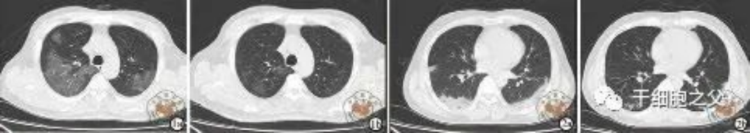 如圖所示,1a-1b:細胞輸注后,炎癥指標改善,復查胸部CT提示雙肺病灶較前吸收,呼吸道癥狀改善,新型冠狀病毒核酸檢測連續2次陰性,治愈出院。圖2a-2b:2次干細胞輸注后炎癥指標改善,復查時(shí)氧合指數升高至301 mmHg,胸部CT提示雙肺病灶較前吸收,患者呼吸道癥狀改善,新型冠狀病毒核酸檢測連續2次陰性,治愈出院。