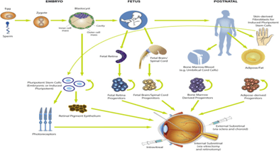 干細胞的想法是,通過(guò)將細胞重新引入眼睛,我們將能夠恢復由退行性視網(wǎng)膜疾病引起的視力[2]。干細胞可以作為身體的修復系統,從一個(gè)未分化的細胞開(kāi)始,然后發(fā)展成一個(gè)特定的細胞 [3]。雖然干細胞是一種未分化細胞,但它們可以經(jīng)歷增殖,然后受到細胞因子刺激,成為一種特殊的特化細胞 [4]。有幾種類(lèi)型的干細胞用于治療視網(wǎng)膜退行性疾?。?mark style="background-color:rgba(0, 0, 0, 0)" class="has-inline-color has-vivid-red-color">視網(wǎng)膜祖細胞 (RPC)、胚胎干細胞 (ESC)、誘導多能干細胞 (iPS)、間充質(zhì)干細胞 (MSC) 和骨髓來(lái)源的VSEL。RPCs起源于胎兒或新生兒視網(wǎng)膜,并在胚胎發(fā)育過(guò)程中產(chǎn)生所有的視網(wǎng)膜細胞。(圖 1)顯示了干細胞的來(lái)源以及它們如何被輸送到視網(wǎng)膜。
