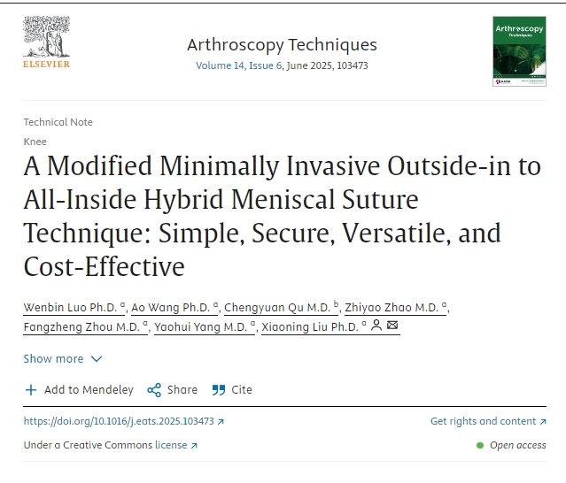 2025年6月26日,吉林大學(xué)第二醫院在《Arthroscopy Techniques》上發(fā)表了一項名為《改良微創(chuàng )外內全內混合半月板縫合技術(shù):簡(jiǎn)單、安全、多功能且經(jīng)濟有效》研究成果。[6]
