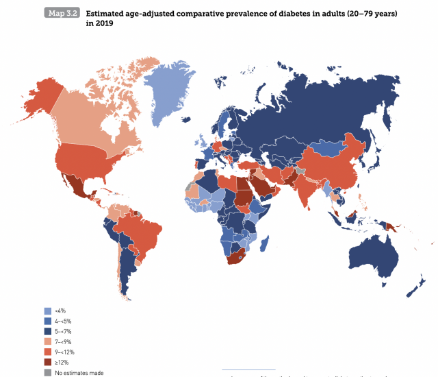 一個(gè)國家和另一個(gè)國家的糖尿病患病率差異很大。以下是按國家劃分的年齡調整后糖尿病患病率地圖: