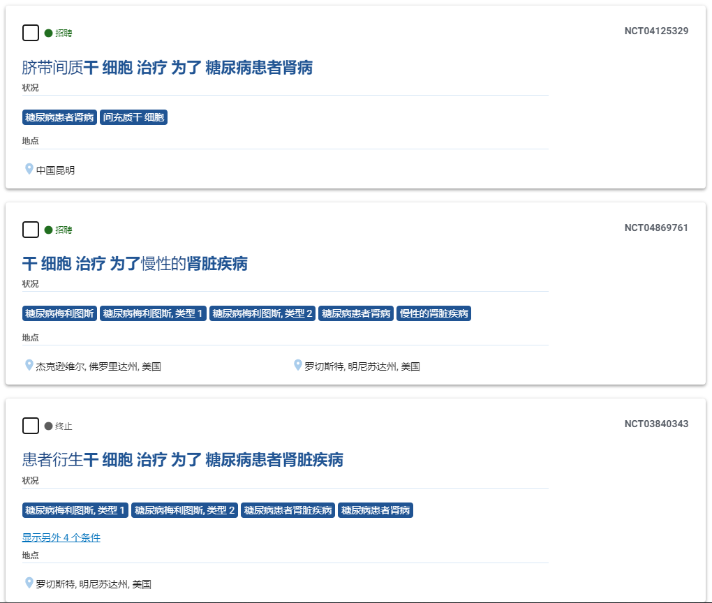 據ClinicalTrials.gov和中國臨床試驗注冊中心顯示,科學(xué)家已開(kāi)展了多項臨床試驗證實(shí)了干細胞療法在糖尿病腎病的有效性和安全性。