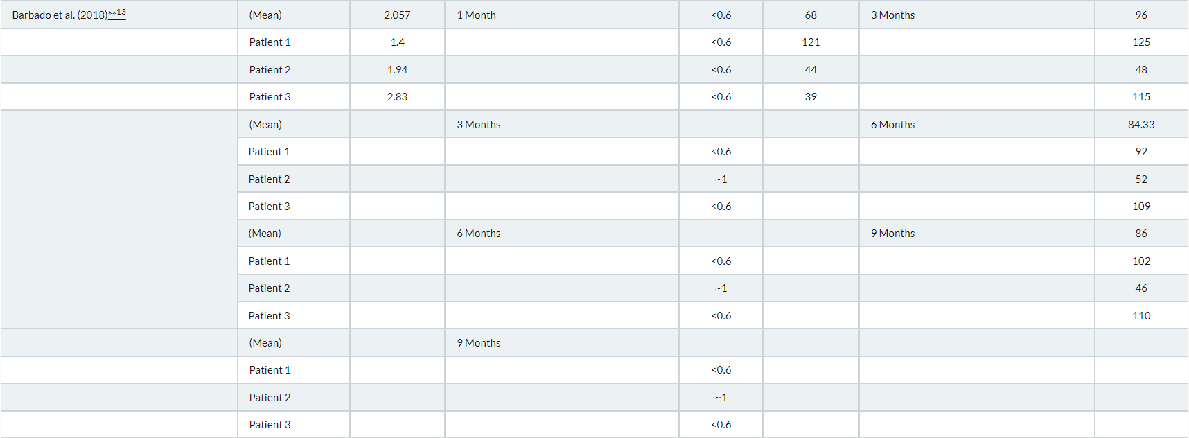 四分之三的研究測量了間充質(zhì)干細胞移植前后的抗dsDNA水平,如表4所示。所有研究中抗dsDNA水平均持續降低。然而,在Gu等人中,直到第12個(gè)月都可以看到逐漸下降,而Ranjbar等人則顯示抗dsDNA水平從第3個(gè)月開(kāi)始出現波動(dòng),盡管統計上并不顯著(zhù)。