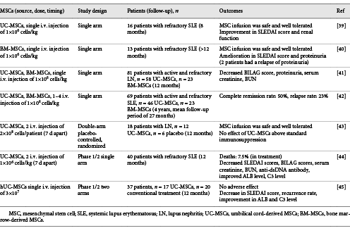 Lazarus等人進(jìn)行了MSC治療的第一個(gè)I期試驗證明了15名患者志愿者離體培養擴增和自體BM-MSC靜脈輸注的安全性。從那時(shí)起,間充質(zhì)干細胞治療免疫性疾病的療法不斷被報道為預防或治療造血干細胞移植后移植物抗宿主病的新工具。間充質(zhì)干細胞移植治療狼瘡性腎炎患者的臨床試驗中進(jìn)行了測試(表1)。