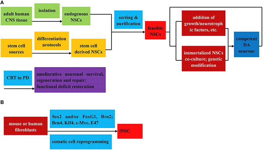 (3) iNSC,由Sox2從小鼠或人成纖維細胞重新編程,有或沒(méi)有其他轉錄因子(B); 所有這些都可以進(jìn)一步分選和純化以獲得可行的NSCs。