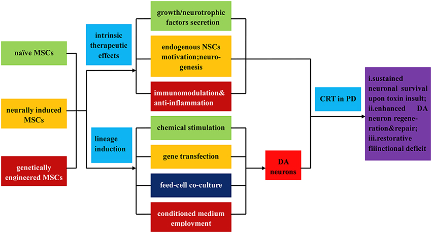 其中,干細胞衍生的神經(jīng)干細胞可以通過(guò)以下兩種方案進(jìn)一步誘導分化為多巴胺神經(jīng)元:(i)添加生長(cháng)因子、神經(jīng)營(yíng)養因子、細胞因子等。培養基誘導神經(jīng)球形成;(ii) 與永生化 NSC 系共培養以引入基因修飾因子。當將上述可行的NSCs和感受態(tài)DA神經(jīng)元應用于PD的CRT治療時(shí),可以觀(guān)察到改善的神經(jīng)元存活狀態(tài)和恢復性功能缺陷。
