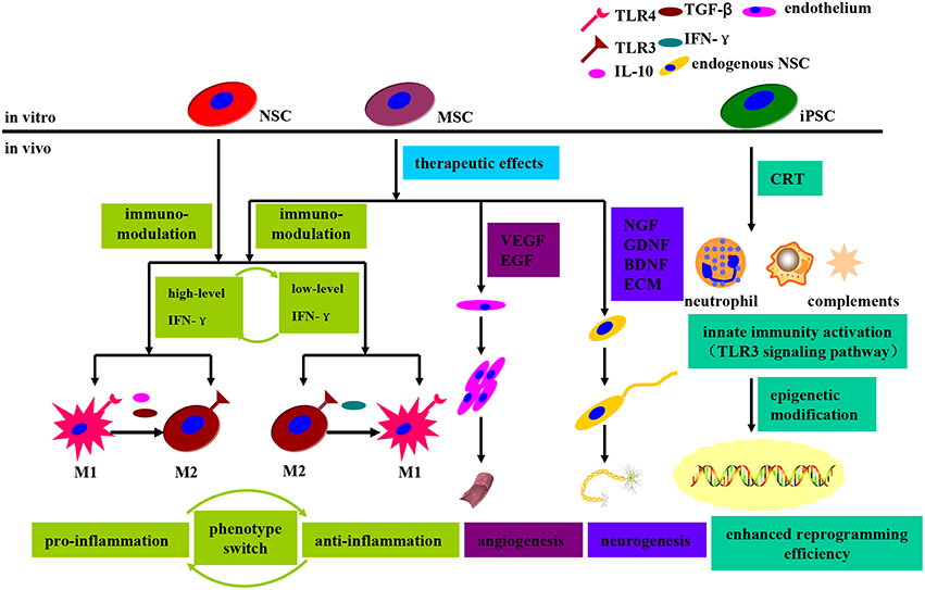 MSCs可分為三種類(lèi)型:na?veMSCs、神經(jīng)誘導的MSCs和基因工程的MSCs,它們都可以在移植后直接發(fā)揮內在治療作用,例如(i)分泌中性粒細胞因子、生長(cháng)因子等;(ii) 內源性 MSCs 動(dòng)機、神經(jīng)發(fā)生和血管生成;(iii) 免疫調節和抗炎作用。
