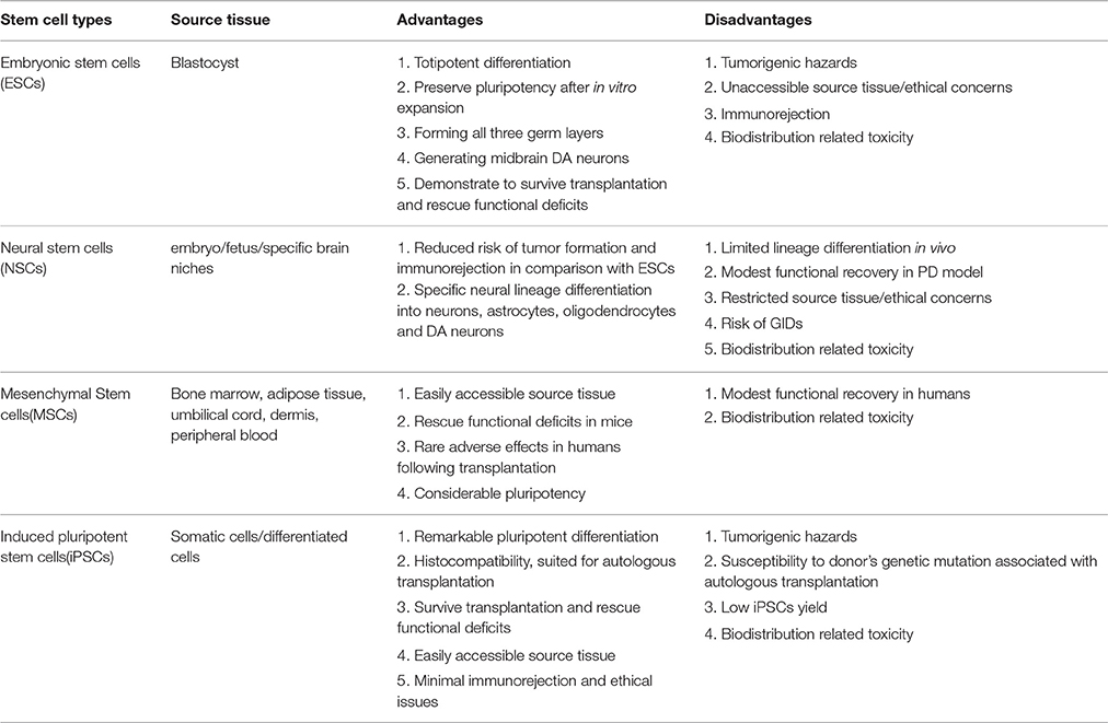 至于NSC,與ESC相比的一個(gè)潛在優(yōu)勢是,除了神經(jīng)譜系分化受限外,它們在移植后不易形成腫瘤和引起免疫排斥反應。然而,神經(jīng)干細胞顯示出一些缺點(diǎn),如有限的分化能力和來(lái)源、揮之不去的倫理問(wèn)題、帕金森癥狀的部分緩解。