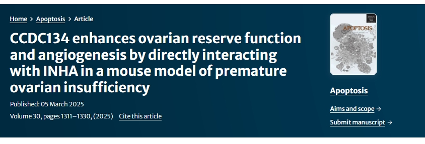 2025年3月5日,山西醫科大學(xué)附屬兒童醫院牽頭在期刊《Apoptosis》上發(fā)表了一篇關(guān)于《CCDC134 通過(guò)與卵巢早衰小鼠模型中的INHA直接相互作用來(lái)增強卵巢儲備功能和血管生成》的研究成果。[6]