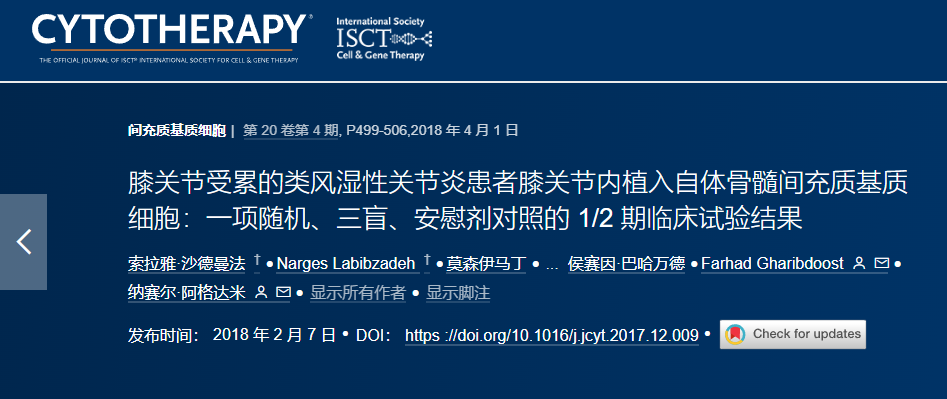2018年4月,伊朗德黑蘭巴基亞塔拉醫科大學(xué)在國際期刊《Mesenchymal stromal cells》上發(fā)布了一篇《膝關(guān)節內植入自體骨髓間充質(zhì)基質(zhì)細胞治療膝關(guān)節受累的類(lèi)風(fēng)濕關(guān)節炎患者:一項隨機、三盲、安慰劑對照的 1/2 期臨床試驗的結果》的研究結果。